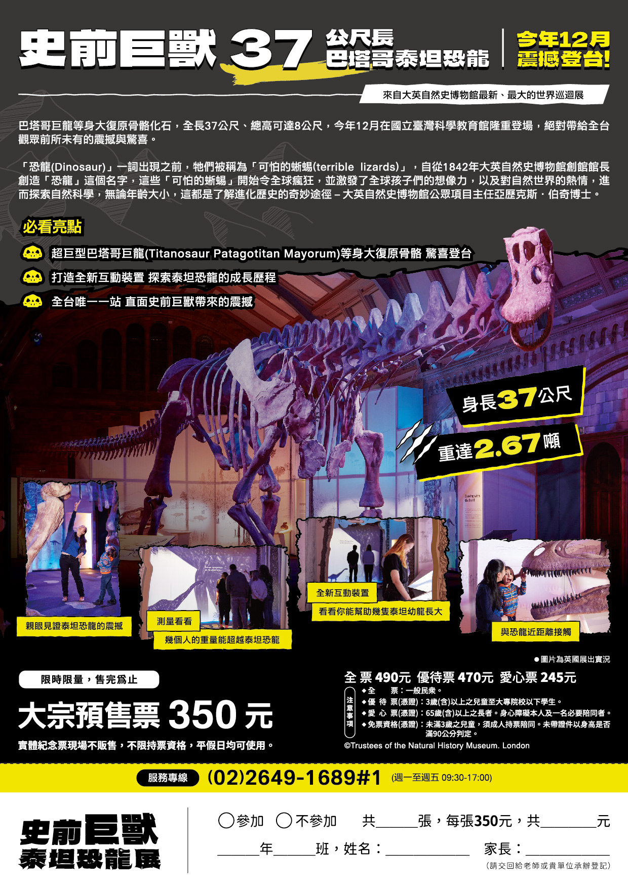 | 一、 | 這是一個有趣的互動展覽,觀眾可以親身感受,並在重達 2.67 噸的泰坦巨龍全身復原骨骼下方觀察,這是迄今為止發現的最完整的巨大恐龍。我們將與全台熱愛恐龍、研究生物的觀眾,探索如此龐大的生物如何能在地球上生存。 |